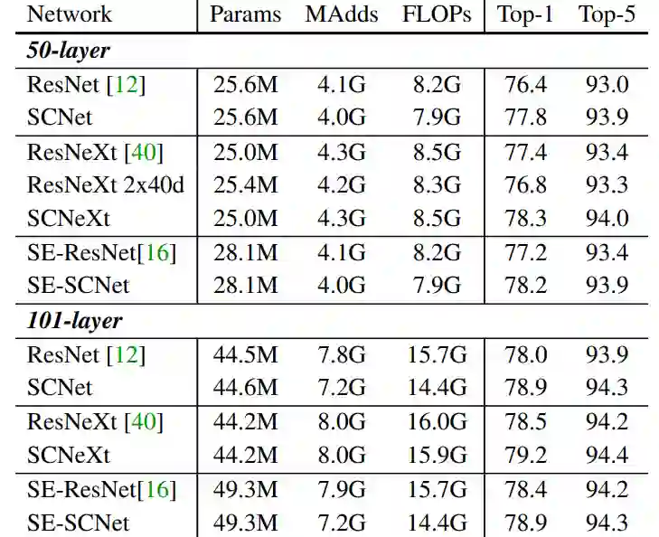 当卷积层分别为 50 和 101 时,具有自校准卷积的网络 SCNeXt、SCNet 和 SE-SCNet 与其他卷积神经网络的结果对比。