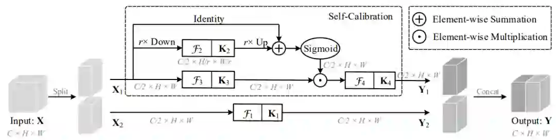 具体来说,与使用小核(如 3×3)融合空间和通道信息的标准卷积不同,研究者提出的自校准卷积通过新型自校准运算(self-calibration operation)围绕每个空间位置自适应地构建远程空间和通道间依赖。如此,通过整合更丰富的信息,CNN 可以生成判别性更强的标准。这种自校准卷积在设计上简单且具有通用性,同时在不引入额外参数和复杂度的情况下可以轻松地运用于扩增的标准卷积层。