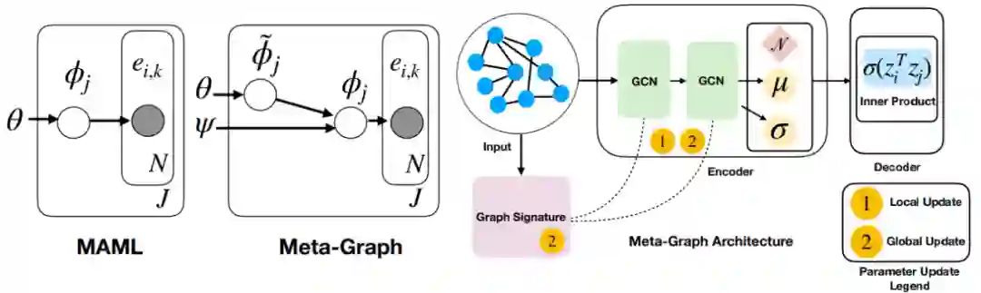 左:Meta-Graph 与 MAML(Model-Agnostic Meta-Learning) 的结构比较;右:Meta-Graph 具体架构。