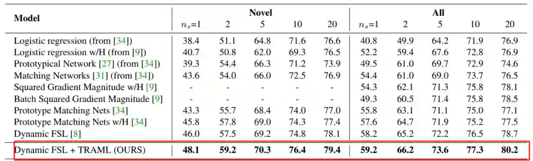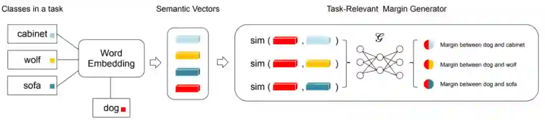 此外,他们将所有类的语义语境整合进一个样例训练任务,并创建任务相关额外边际损失以更好地区分不同类的样本。这种自适应边际方法可以轻松地扩展至更真实的泛化 FSL 设置。