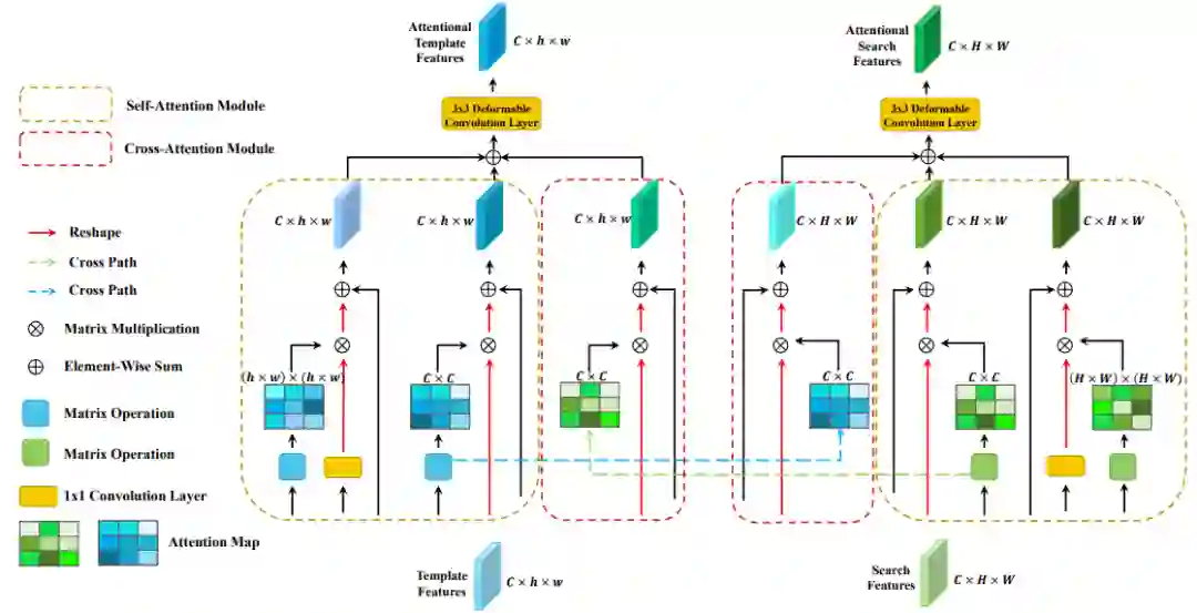 可变形孪生注意力模块包括两个子模块:self-attention 子模块和 cross-attention 子模块。
