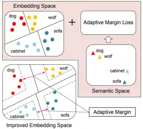 自适应边际损失方法的原理图。研究者利用不同类之间的语义相似性来生成类间自适应边际,然后将生成的边际集成至分类损失中,使得相似类在嵌入空间中的可分离性更强,由此有益于少样本学习。