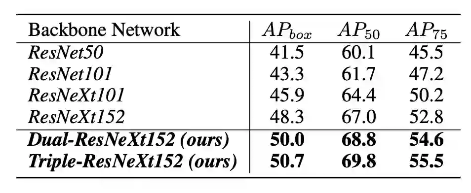 Triple-ResNeXt152(3 个 ResNeXt152 组成的 CBNet 架构)在 COCO 数据集上实现了最新 SOTA 结果(mAP 达到 53.3),优于之前的目标检测器。