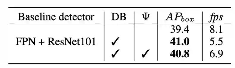 如下表 6 所示,DB 将 FPN 的 AP 提升了 1.6%,但检测速度从 8.1 fps 降低到了 5.5 fps。