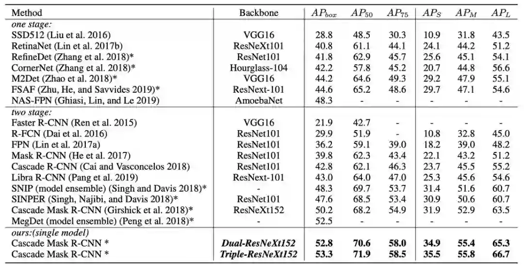 表 3:CBNet 方法和当前最优检测器在 COCO test-dev 数据集上的目标检测性能对比。* 表示使用了多尺度测试。
