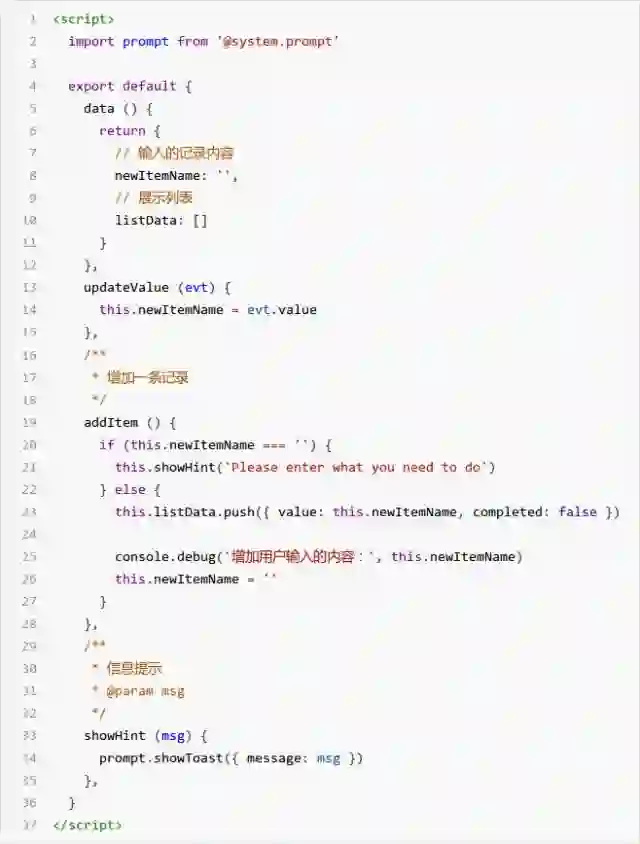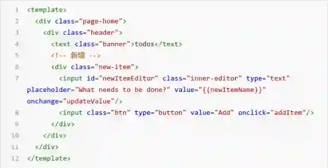 1) ViewModel 的 data 中定义 newItemName 属性用于记录用户输入的内容