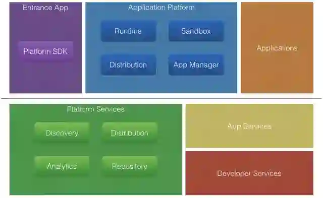 2 . 横线下方是服务器,包括上文提到的诸如推送、帐号、支付等常见的应用服务,以及开发者后台服务,另外就是平台自身的各种服务,比如分发、统计、应用仓库等服务