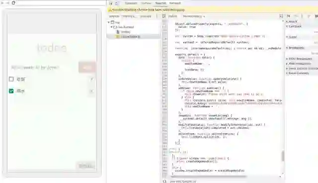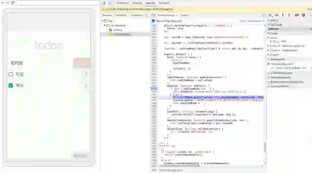 如上图所示,在 addItem() 内打断点,当手机完成点击 Add 按钮时会将 JS 线程停止到断点处,然后就可以做单步调试了。