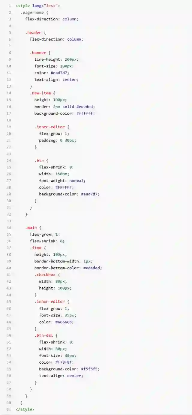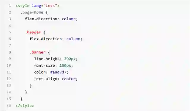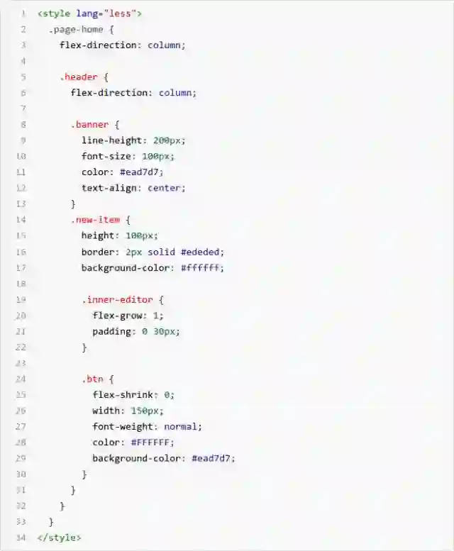 2) style:即 CSS 样式表,用于配置页面样式,为了方便 CSS 预处理,我们也支持 less 预编译能力,在 style 节点上增加属性 lang="less"的声明即可