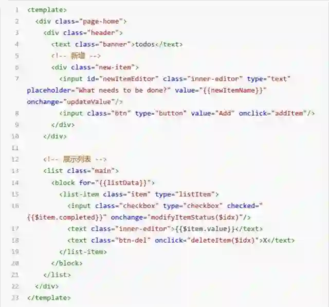 7) 增加 text 组件,展示 X 删除待办事项的功能,绑定 click 事件到方法 deleteItem($idx)
