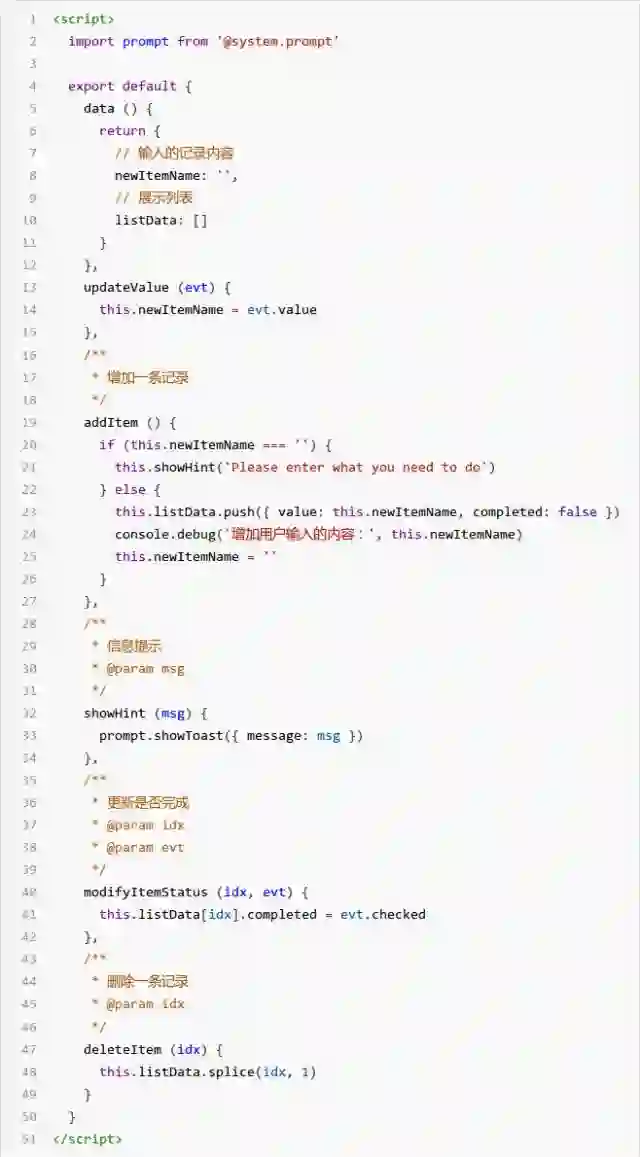 2) 新增方法 deleteItem():点击列表中每行结束时的 X 标识,用于删除该条记录
