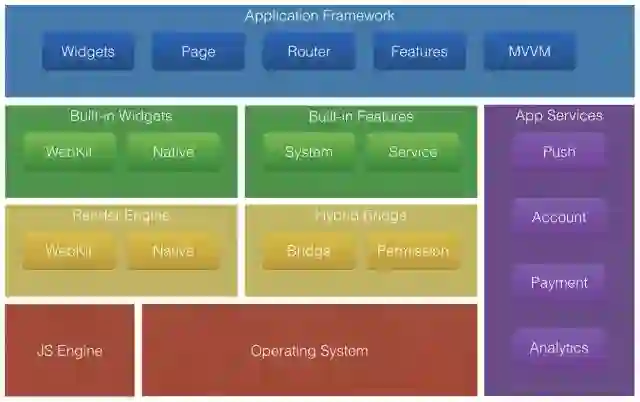 2 . 中间黄色部分,我们提供了一套桥接能力,将系统的接口能力暴露到前端,在此基础之上,我们暴露了大量的系统能力,比如文件存储、二维码扫描、设备信息等等,另外还集成了很多常见服务,比如推送、帐号、支付等等,在右侧紫色部分表示
