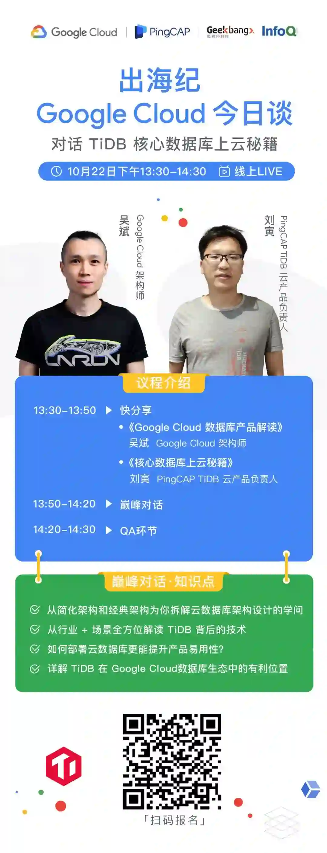 PingCAP 打造了国内第一个 NewSQL 开源项目——TiDB ,在核心数据库上云领域有着非常硬核的实战经验,而 Google Cloud 在云计算和大数据技术的落地实践上也是佼佼者,这一场强强碰撞的对话一定能给你带来更多关于数据库上云的思考、灵感!
