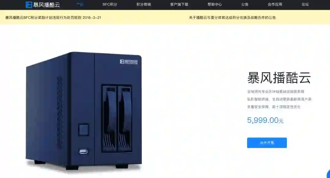 官方介绍显示,该产品的闲置存储空间及带宽可以用于赚取BFC积分,可为暴风系列软件及第三方CDN业务提供超大文件的存储及带宽支持,同时支持部署、甚至作为第三方区块链网络的全节点。