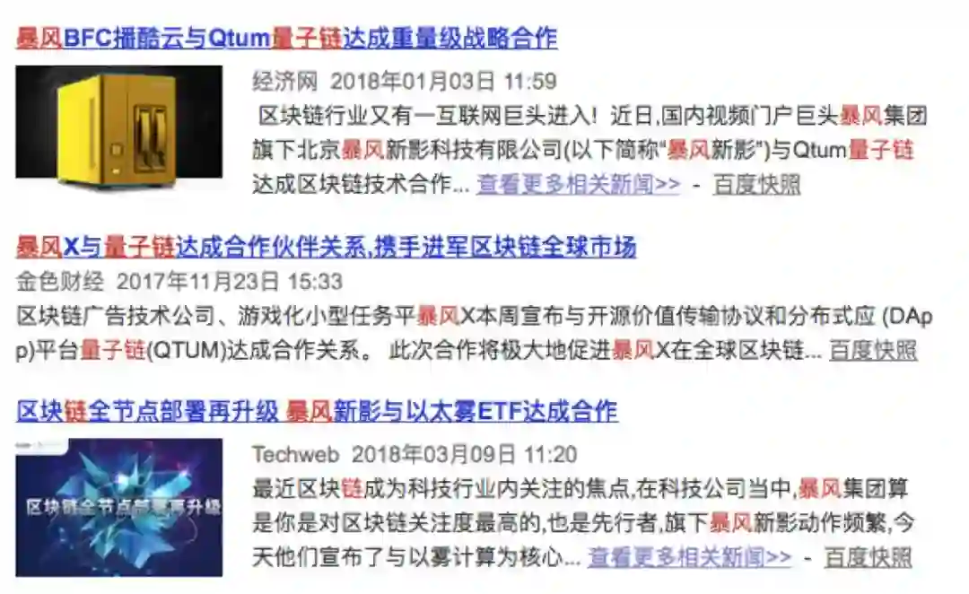 1月初,暴风新影还与Qtum量子链正式达成区块链技术合作协议——BCN(Blockchain Consensus Network)网络服务协议,双方将在区块链网络中全节点的部署、区块链与视频行业融合、区块链开源社区建设等方面进行一系列合作。