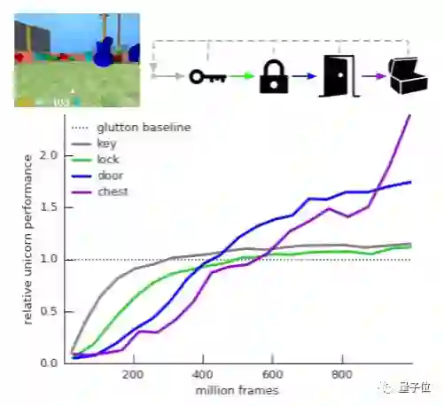 使这个领域变得最为挑战的是,物体需要以特定的顺序收集起来。例如,箱子只有在智能体已经收集了钥匙、锁和门的情况下才起作用。