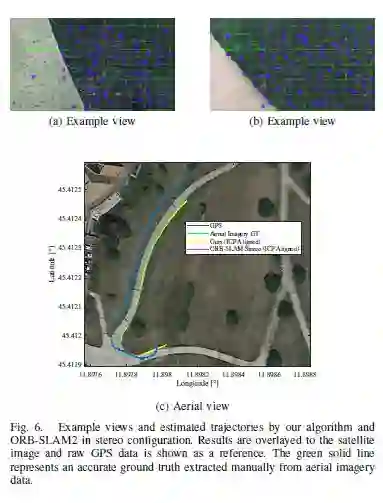图6.示例数据和文章方法及ORB-SLAM2方法得到的轨迹对比。结果置于一张卫星影像上,原始GPS数据作为参照。绿色实线代表精确的ground truth。
