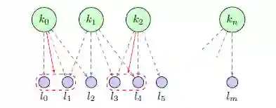 图2. 单目SLAM问题联合高度计测量数据的factor graph。绿色和蓝色的节点是关键帧和地标姿态。灰色虚线是每一个位姿可以观测到的地表点,红色实线代表了距离测量值。红色虚线包围的是高度计测量值最邻近的地标节点。