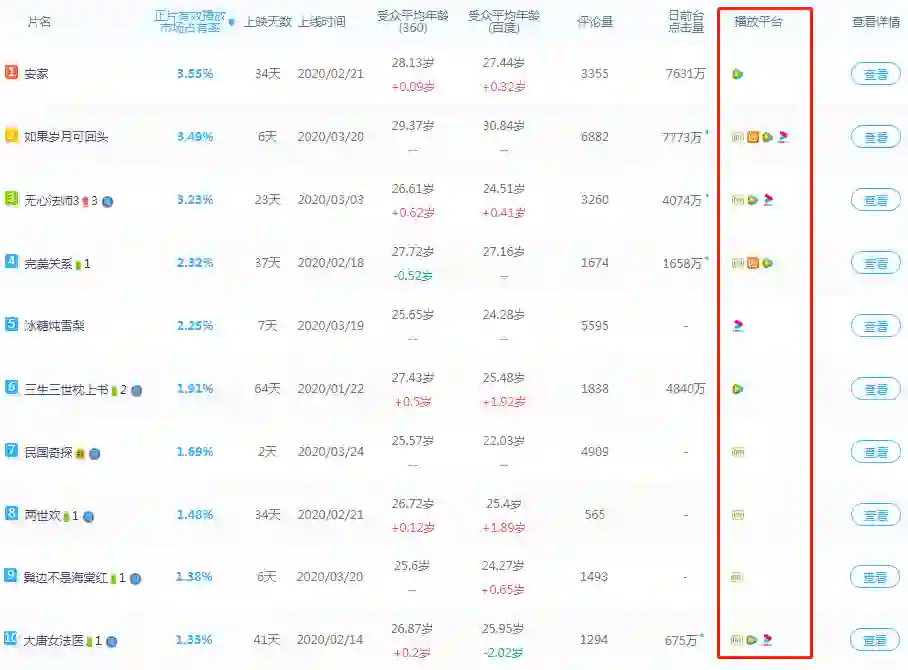 截至2020年3月25日,据骨朵数据和云合数据统计,网剧热度排行榜Top10几乎由优酷、爱奇艺、腾讯视频、芒果TV包揽。