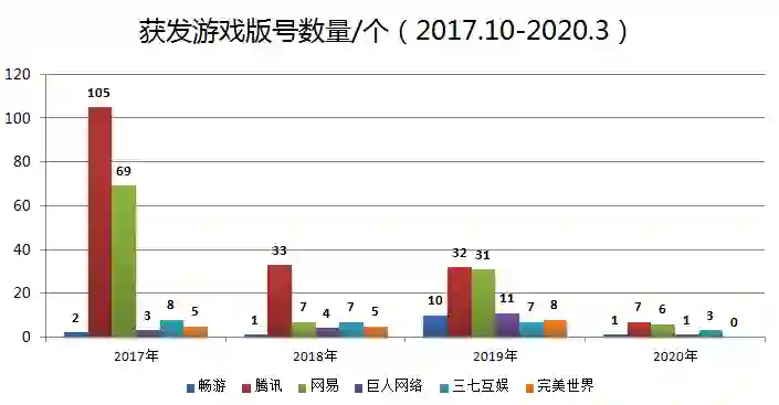 另一方面,36氪统计了2017年10月-2020年3月间腾讯、网易、巨人网络、三七互娱、完美世界的游戏版号数量。畅游新游戏的输出力度稍显不足。