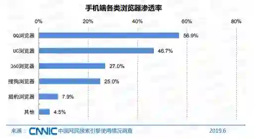 据中国互联网信息中心(CNNIC)统计,搜狗搜索的品牌渗透率比排名第一的百度搜索低37.4%。从手机端搜索引擎用户的首选率来看,位列第二的搜狗搜索的首选率仅13.9%,远不及百度搜索(66.8%);从手机端各类浏览器渗透率来看,搜狗浏览器排名第四,渗透率仅为25%。