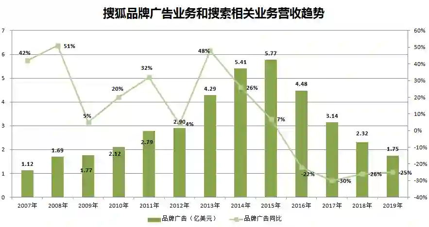 搜索业务是搜狐最主要的营收支柱。而2010年至今,其搜索及搜索相关的广告收入业务的营收同比增速总体上不断放缓。