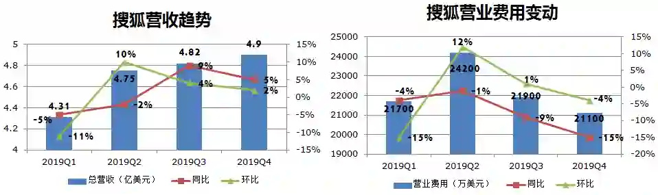 虽然搜狐近5个季度的亏损额不断缩小,但从其营收状况和费用支出情况来看,2019年Q4,搜狐营收增速同比环比双降,同时Q3、Q4两季度营业费用持续降低。这意味着搜狐本季度的盈利或是“节流”成效初显。