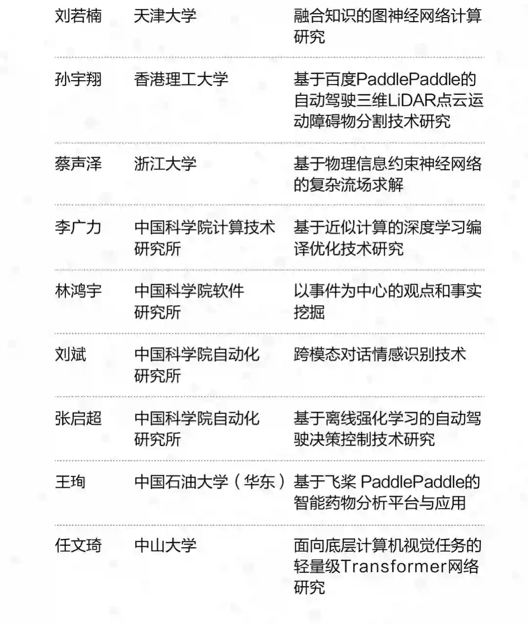 本届获资助课题含金量颇高,既有针对学习算法、排序模型、问答技术等方向的前沿研究,也有探讨将人工智能与自动驾驶、医疗和能源等领域需求深度结合的课题。如南京大学副教授程龚提出的“基于数值表和文本信息融合的问答技术研究”,聚焦自然语言处理领域的新方向;中国科学院自动化研究所副研究员张启超提出的“基于离线强化学习的自动驾驶决策控制技术研究”,具备创新性,对自动驾驶有较高的研究价值;北京理工大学助理教授李爽的入围课题“工业视觉质检中的高效迁移学习方法研究”,则具有广阔的行业应用空间。