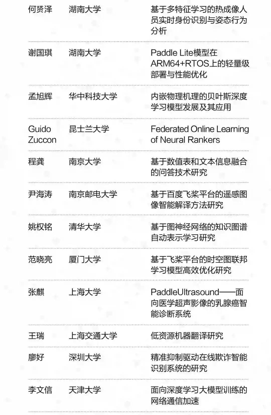 本届CCF-百度松果基金申请者来自北京大学、清华大学、中国科学院、香港理工大学等上百所高校和机构,经综合评审,30名来自海内外高校和机构的青年学者获本届CCF-百度松果基金资助。