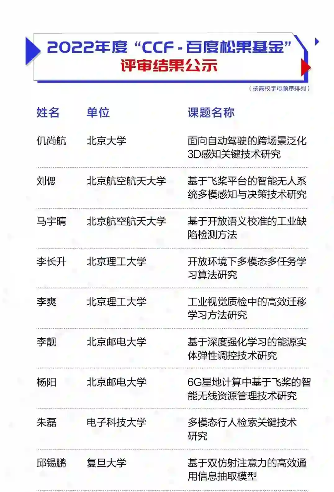 7月8日,2022年度CCF-百度松果基金评审结果公布,30名来自海内外高校和机构的青年学者,从近300位申请者中脱颖而出,成为本届CCF-百度松果基金得主。百度将为入围者提供数百万科研资金,助其开展科研工作、孵化创新成果。