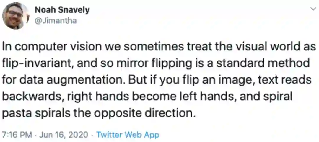 然而,视觉手性是大部分视觉领域都拥有的属性。正如此篇文章作者,谷歌AI科学家Noah Snavely教授所说: