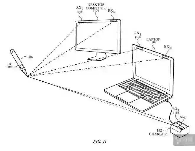 具体的实现方法上,这三位工程师故意用了含糊其辞的说明方式,只表示该触控笔的移动能够通过方向传感器和三角测量方案来进行追踪,测量方式则有可能是摄像机(图像追踪)、电磁或声音。从图上可以看到,当 Mac 上存在两个传感器时,就能够和笔尖形成一个三角形,根据传感器间距和高度信息就能够识别出笔尖所在的位置了。