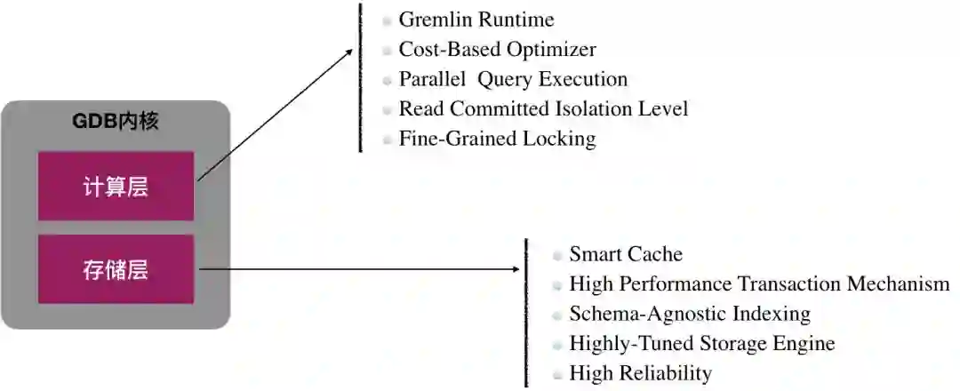 整体上,图数据库内核包含计算和存储两层,计算层专注在图相关能力抽象及实现,存储层专注在数据的内部布局及高效存取。下面将对GDB内核的部分核心能力进行进一步解析: