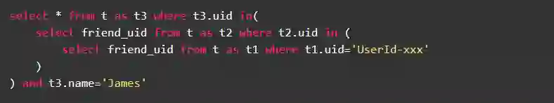 比如,用户UserId-xxx发起“_查询自己2度好友中名字叫James的人_”这样一个查询请求。以传统关系数据库的做法,你可能会写出如下查询语句: