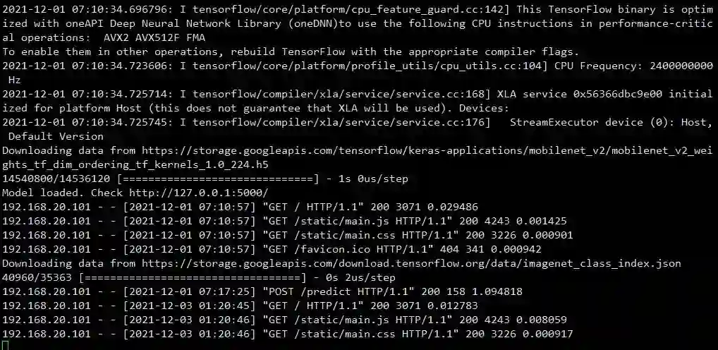 下面进入正文,来看基于docker和Flask如何快速部署一个深度学习模型,模型是一个基于MobileNetV2的图像分类器。用于启动REST API的app.py文件代码编写如下: