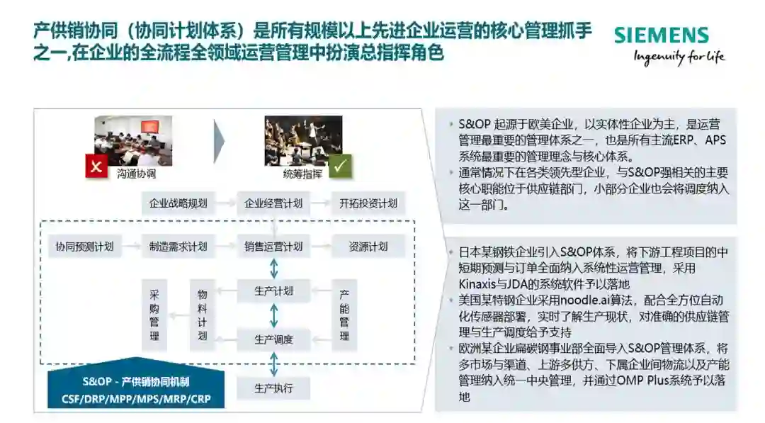 西门子建议加强产供销协同计划、大宗物料的市场价格监控、统一的信息共享平台建设等职能,同时进一步开展销售与采购大数据分析、智慧订单系统建设等工作;并通过流程再造,可进一步打通不同计划职能间的信息孤岛,实现一级计划与一级调度。同时,避免了原有信息传递过程中人为因素产生的干扰,大大提高工作效率,促进业务人员从事务处理向事务管理向决策管理的转型。