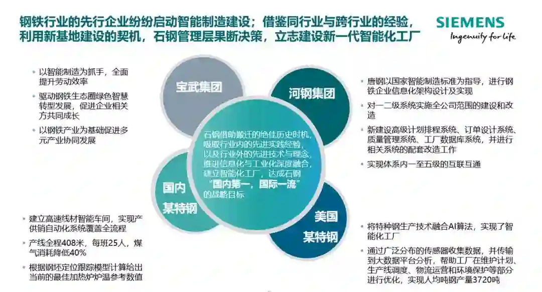 西门子咨询团队首先充分理解客户的切实需要,本着简单高效低成本原则,借由行业内外对标、并借鉴西门子与国内外知名钢铁企业合作的已有经验,用数字化手段推动制造技术与信息技术的深度融合,助力河钢石钢构建全流程智能制造体系。旨在打造 ”国内第一、国际一流” 的 “最具竞争力特钢企业、代表河钢集团品牌形象的标志性企业和河钢乃至中国钢铁未来示范工厂”;实现河钢石钢的“绿色、智能、节能、高质量、高效益”的产业目标,确保企业在未来几年到几十年的发展中持续保有强有力的竞争力。