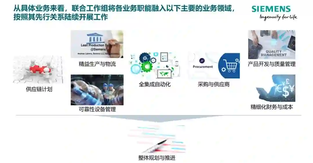 西门子咨询结合河钢石钢发展,将数字化与企业管理理念充分融合,完成了7大管理体系包含14个端到端业务领域的流程优化与再造,涉及供应链计划、精益生产与物流、可靠性设备管理、全集成自动化、采购与供应商管理、产品开发与质量管理、以及精细化财务与成本管控。