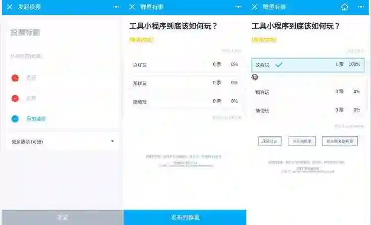 同样的思路,另一款现象级小程序「群里有事」则算是一个更完善的解决方案,这款出自和菜头之手的小程序,瞄准的就是微信群聊中一系列功能痛点。从群公告、群活动、群投票到求祝福。针对的都是微信群聊中的功能缺失,优化群功能的通知效果,甚至能看到有多少群成员看到了公告;以及和群约助手一样的线上活动组织;尤其像「群投票」这样的低频刚需,更是十分切中痛点。