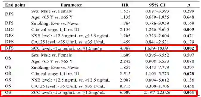 SCC在鳞状细胞癌的血清、胸液、活检组织浓度升高,有助于NSCLC尤其是肺鳞癌的鉴别诊断。一项入组481例肺鳞癌患者的研究发现,SCC血清水平对无进展生存期(DFS)及总生存期(OS)均有预测作用,SCC高水平患者DFS及OS均较短(如图2)[6]。SCC结合CT等影像学手段,可提高高风险患者的早期检出率。