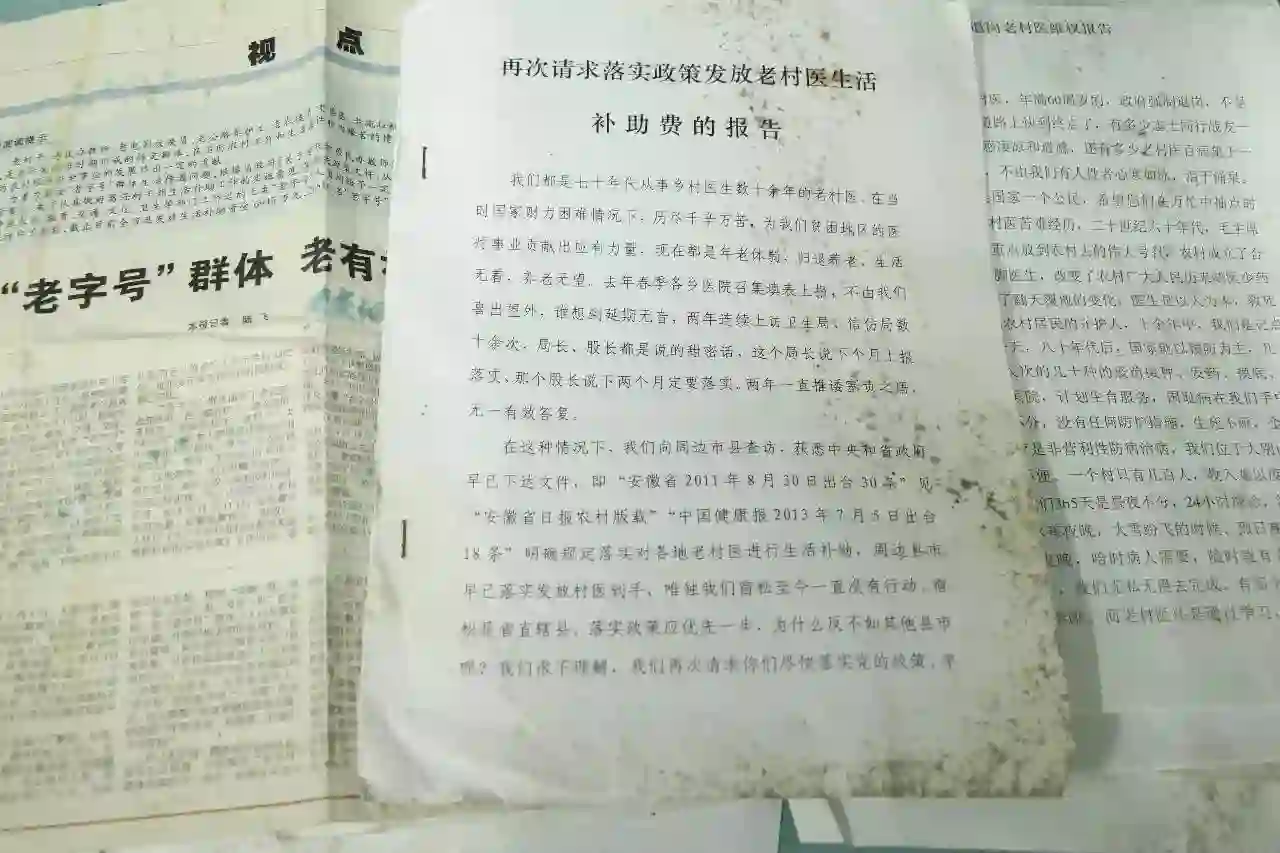 安徽省的退岗老村医将自己的事迹写在《退岗医生维权报告上》,李金龙这些年也参加了要求落实政策的维权之路,他收集的维权报告、报纸、打印资料、请求书已经装了满满一大袋,纸张长期存放在潮湿的屋里,散发着一股奇怪的味道,《再次请求落实政策发放老村医生活补助的报告》的上面布满灰黑色的霉迹。