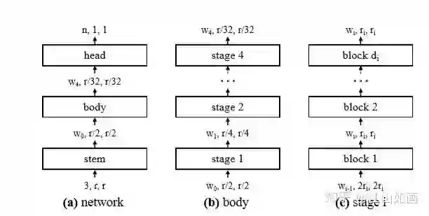 既然文章强调的是对搜索空间的设计,那么相较于对单个网络的设计而言,搜索空间要足够的大,从一个足够大的空间开始,逐步的缩小空间,提高效果。所以文章给出的最初始化的网络,叫AnyNet,可以说,在相同的setting下,凡是搜索的网络(或者空间)都是该网络的子网络(子空间)。