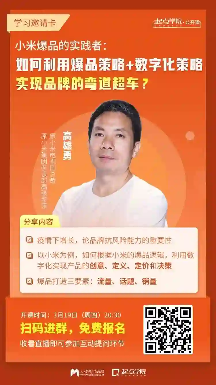 本周四(3月19日)20:30,起点学院公开课特别邀请了原小米电视副总裁、原小米集团参谋部高级参谋@高雄勇老师,他将结合小米打造爆款产品的经历,与你聊聊如何利用爆品策略+数字化策略,实现品牌的弯道超车!