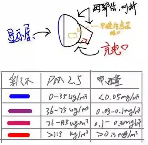 它有三个功能,第一个是显示日常温度和湿度,第二个是显示PM2.5数值。第三个是显示甲醛数值。按说明书提示,第一次测甲醛之前,需要对测试的房间通风,不然数值会偏高。。首次启动时把它放到通风的地方大概3min数值就会降低到0.05以下。之后就可以放在房间里进行测试啦。下面是我的灵魂手绘……