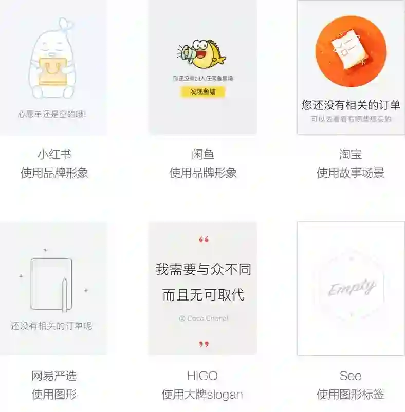 小红书、闲鱼、淘宝使用品牌形象作为空状态的主体形象,主体形象使用品牌形象既能实现空状态功能,也能不断的增强品牌在用户心中的形象。网易严选、HIGO、See使用了文字、图形作为空状态的主体形象。