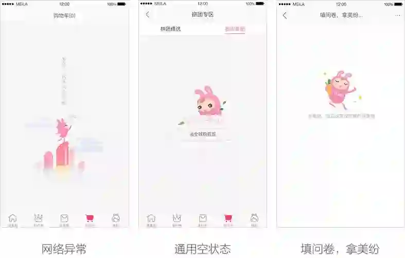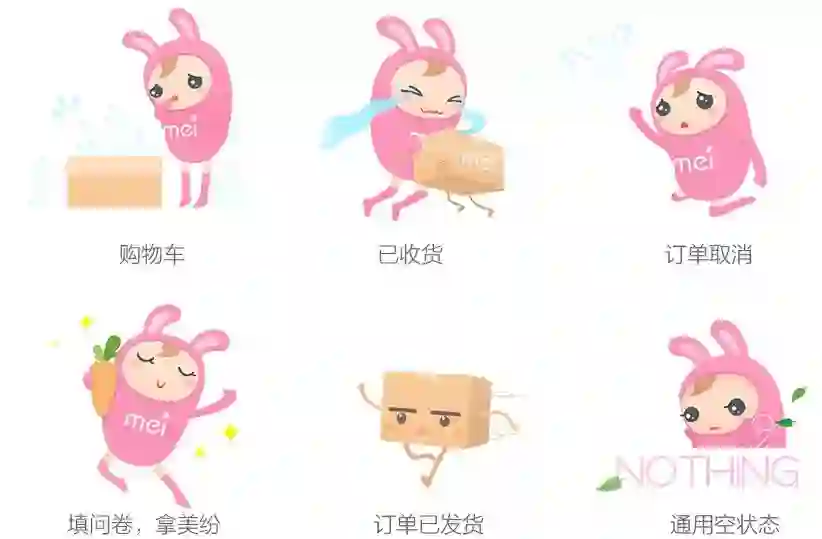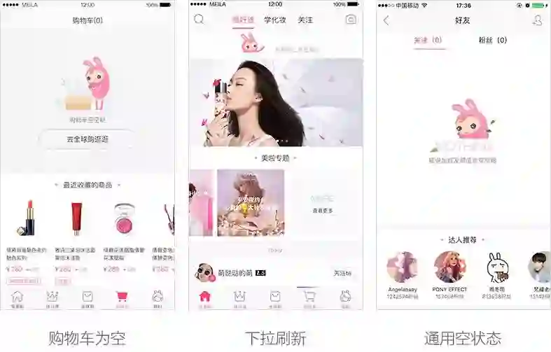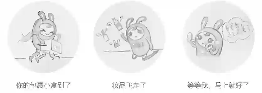 美啦5.0空状态使用了品牌新形象:美啦兔——活泼又爱美兔子和她的小伙伴——负责送妆品的博克斯,一起作为美啦的代表与用户互动。我们希望用户在美啦的体验是顺畅的,但当她遇到空状态时,有美啦兔陪伴她。