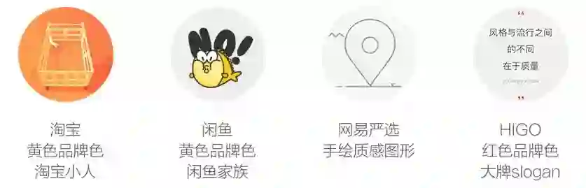 小红书、闲鱼使用了萌萌的小红薯和闲鱼,淘宝使用了小人,网易严选使用了场景相关的物品,See和HIGO使用了文字及图标。拟人的形象更能拉近产品与用户的距离。