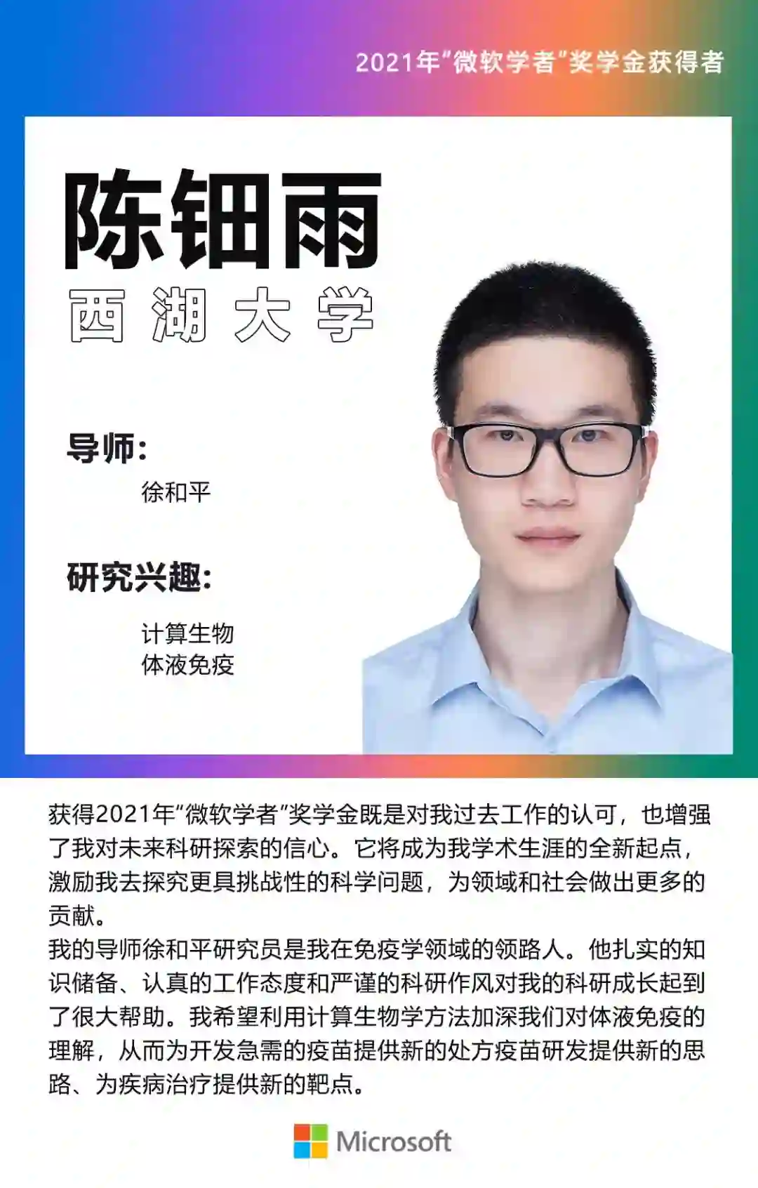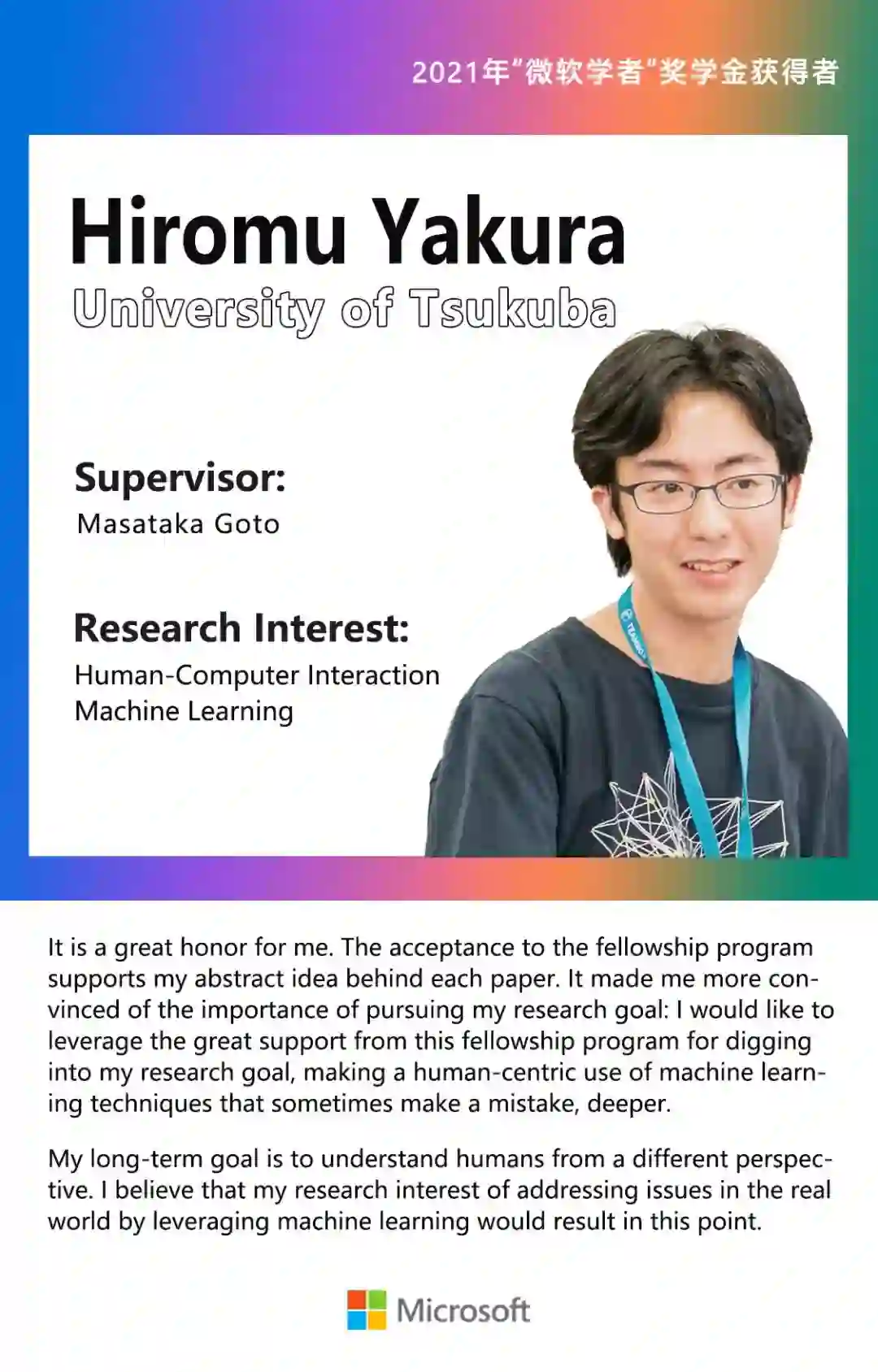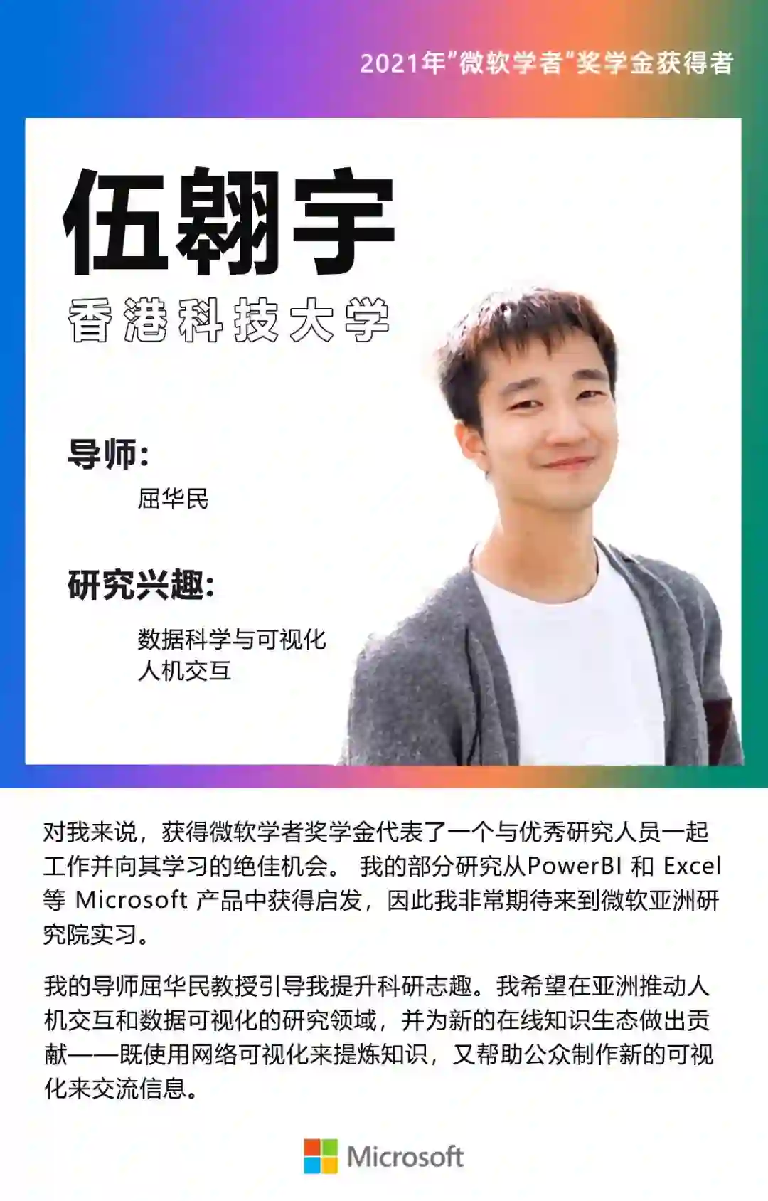 本次“微软学者”奖学金的获得者们既脚踏实地也仰望星空:他们在认真探索科研的同时,怀揣着以科学、技术造福社会的赤子情怀。这也与“微软学者”奖学金赋能下一代杰出的计算机科研人才的初衷相吻合。