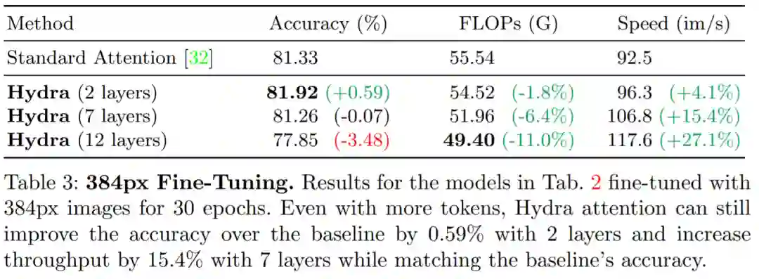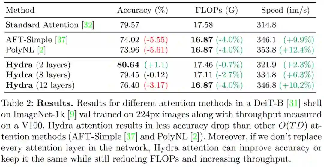 表 2 展示了使用 Hydra attention 与标准注意以及其他方法对比的结果:
