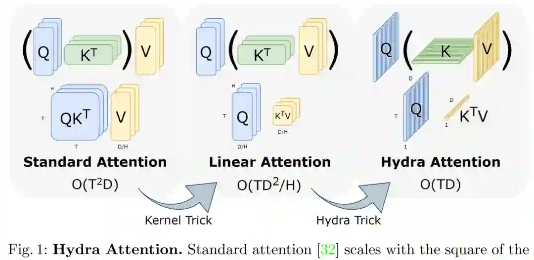 近日, Meta AI 和佐治亚理工学院的研究者填补了这一空白,提出了 Hydra Attention。该方法源于线性注意力中有些自相矛盾的行为,即在使用标准多头自注意力时,向模型中添加更多的 head 会保持计算量不变。但是,在线性注意力中改变操作顺序后,添加更多的 head 实际上降低了层的计算成本。